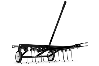 Dethatch a 40″ swath and clean it up by using a bagger at the same time. The dethatcher features all-steel construction, 10 double spring tines, 7″ x 1.75″ front wheel, and a handle with lift position for transport. A one time bracket installation on tractor is required then dethatcher removes or installs without tools. 40″ width.